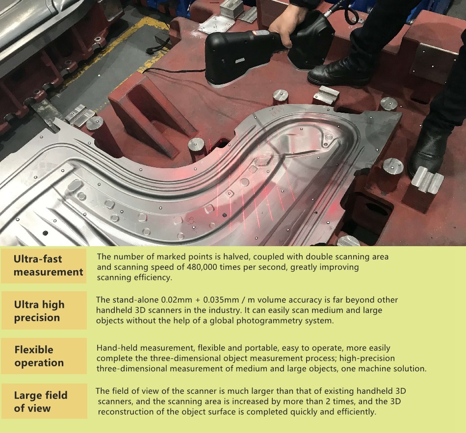 AXE 3D scanner is another global innovative handheld 3D scanner. In addition to all the features and functions of other hand-held laser 3D scanners, the AXE series' breakthrough is to subvert the way of measuring medium and large objects. AXE can complete high-precision scanning of medium and large objects without using any equipment. The volume accuracy of a single machine is far better than other handheld 3D scanners, and the double scanning area greatly increases the 3D scanning speed. |