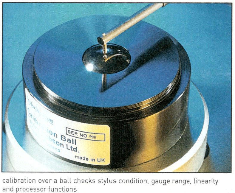 During calibration with a Form Talysurf, the stylus is traversed over the spherical artifact to make contact at all points along the radius of the conisphere tip in the measurement direction. By this method, the user can detect effects due to stylus damage or deviations of size and shape.