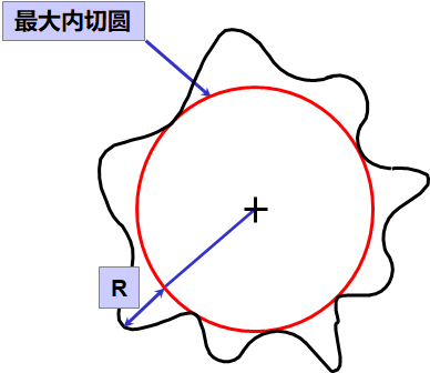 ? *大內切(MI)參考圓圓度值 (RONt) = R![]() *大內接圓,有時也稱為塞規圓,是完全被輪廓包圍的*大圓。 圓度誤差被量化為離參考圓的*大徑向偏差量(RONt)。 與*小區域圓一樣,*大內接圓中心確定之后,圓度值是通過峰到谷的半徑差值得到的。 ![]() |