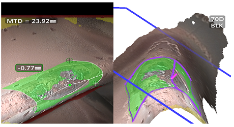 工業視頻內窺鏡MViQ的“測量參考面”功能,可通過一-次測量 同時準確測得軸向及徑向損傷的長度,也可以實現對葉尖丟失面積的精準測量