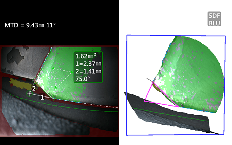 測量前往往需要打點,打點不準將導致測量結果的不準確。傳統雙物鏡測量是在二維平面模式下打點,由于拍攝角度問題有可能造成視覺錯覺而導致打點位置錯誤; MViQ的相位掃描測量技術可以實時地以三維立體的形式還原缺陷及測量打點位置,保證測量打點位置的準確度,從而提高測量精確度。