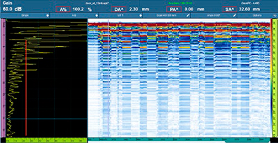 EdgeFORM探頭可以在沒有涂漆的表面上平滑滾動,而不會留下刮痕或可見的缺陷。輪子的壓縮會在粘結接縫的長度方向上提供一致的耦合效果,而C掃描可以清晰地顯示部件的粘結情況:紅色表明未粘結區域,藍色表明粘結區域。