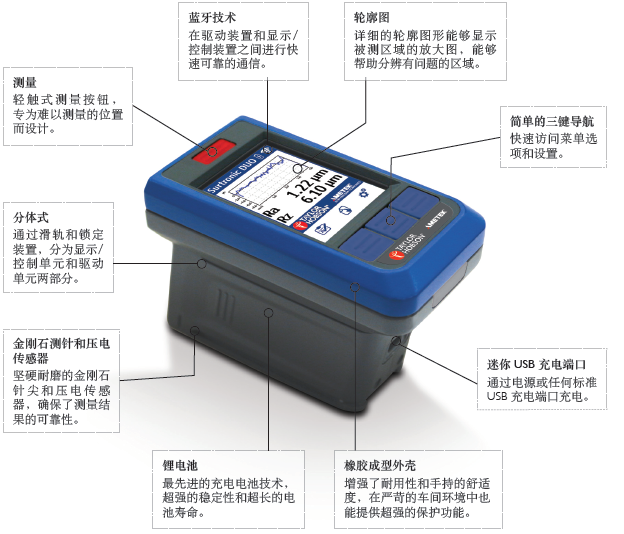 ● 金剛石測針和壓電傳感器 - 帶金剛石尖端的堅固耐磨的壓電傳感器測針,確保測量結果的可靠性;
