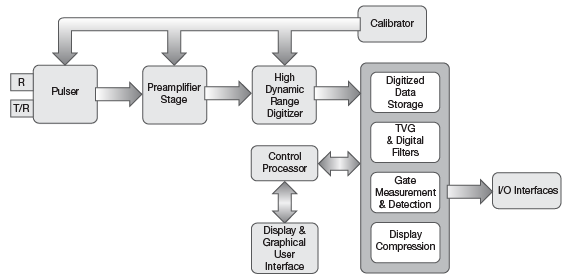 現(xiàn)代超聲探傷儀都是一些基于微處理器的小巧便攜式儀器,既可以在廠房車間內(nèi)使用,也可以在野外的露天環(huán)境中使用。這些儀器可生成并顯示超聲波形,受過培訓(xùn)的操作人員對這些波形進(jìn)行解讀,(解讀過程通常要借助于分析軟件完成),以定位被測樣件中的缺陷,并對缺陷進(jìn)行分類。一般來說,檢測操作需要一個超聲脈沖發(fā)生器/接收器、用于信號采集和分析的硬件和軟件、一個波形顯示屏,以及一個數(shù)據(jù)記錄模塊。盡管還會生產(chǎn)一些基于模擬方式的探傷儀,大多數(shù)當(dāng)代儀器都使用數(shù)字式信號處理方式,以獲得穩(wěn)定的信號和準(zhǔn)確的數(shù)據(jù)。