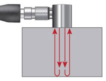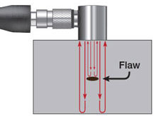 基本原理:在一種介質(zhì)中傳播的聲能會一直傳播,直到遇到另一種材料的介質(zhì)時,如:圍繞底面的空氣或由裂紋或類似的不連續(xù)性形成的空隙,聲能會從兩種介質(zhì)的邊界上散播或反射回來。在這類檢測中,操作人員將探頭耦合到被檢樣件,并辨別從底面返回的回波,以及任何來自某些幾何結(jié)構(gòu)的固定反射信號,如:凹槽或凸緣。記下來自合格工件的回波的特征圖形后,操作人員就可以尋找被測工件中出現(xiàn)在底面回波前的任何其它回波,對出現(xiàn)的晶粒散射噪波,可以不予考慮。出現(xiàn)在底面回波前面的具有重要聲學(xué)意義的回波意味著可能存在層狀裂紋或孔隙。通過進(jìn)一步分析,可以確定產(chǎn)生反射信號的結(jié)構(gòu)(反射體)的深度、大小和形狀。