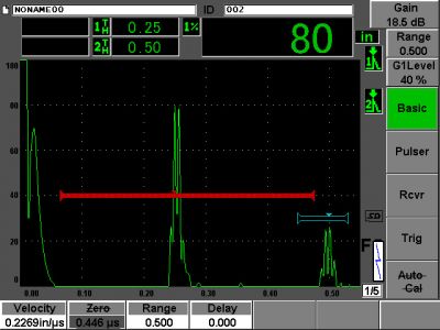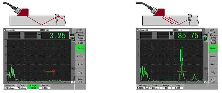 正如垂直聲束檢測,在角度聲束檢測中,操作人員要尋找對應(yīng)于不連續(xù)性缺陷的反射信號。在進(jìn)行初始設(shè)置時,操作人員須記下來自焊道或其他幾何結(jié)構(gòu)的任何回波。在代表焊縫的區(qū)域中出現(xiàn)的其他回波可能來自于未融合、裂紋、多孔性或其他不連續(xù)性缺陷,通過進(jìn)一步分析,可以確定這些缺陷的類型、深度和大小。