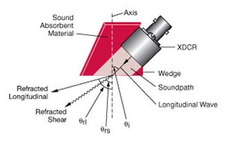 角度聲束探頭包含一個探頭和一個楔塊,探頭和楔塊可以是分開的部件,也可以被安裝在同一個外殼中。它們使用折射原理,在兩種介質(zhì)的邊界處發(fā)生的模式轉(zhuǎn)換會在被測樣件中生成折射橫波或縱波,如右圖所示。