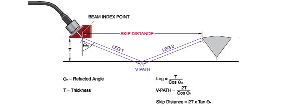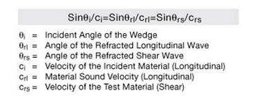 大多數(shù)常用角度聲束探頭會在被測材料中生成45度、60度或70度標(biāo)準(zhǔn)角度的折射橫波。生成想要折射角度所需的入射角度基于材料的聲速,并根據(jù)斯涅爾法則,通過以下公式計算。