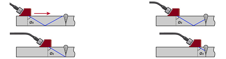 在一般的檢測中,聲束會以生成的角度向下傳播到被測樣件的底面,然后再以相同的角度向上反射。前后移動探頭會使聲束掃查到焊縫的整個高度。這種掃查運(yùn)動可以對整個焊縫體積進(jìn)行檢測,而且可以探測到焊縫的融合線處以及焊縫體積內(nèi)的不連續(xù)性缺陷。