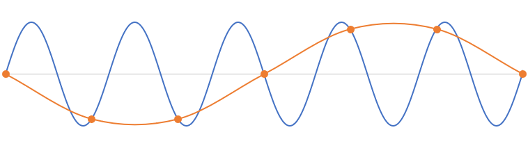 假如在測量過程中的采樣頻率過低(即采樣間隔過大),就會產生錯誤識別信號頻率的現象。參見下圖。采樣頻率不夠高的話,電腦中采集到的信號就會是橙色的曲線,而實際表面的輪廓形狀是藍色的曲線。