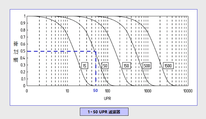藍色虛線表示在50 upr處傳感器信號的通過率是50%。