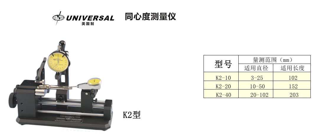 美國環球K2-10、K2-20、K2-40同心度儀,測量標準量規可保證精度在 ≤ 4μm (.00016") 以內。高精度可保證精度在 2μm (.00008”) 以內。具有結構合理、精度高、誤差小、適用范圍廣泛、使用維護方便等特點、是理想的專用測量工具。