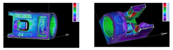 可以通過擬合由TomoScope和CAD獲取的STL(多邊形)數據來分析偏差。 在下圖中,測量了STL與CAD的偏差,紅色是產品腫脹的地方,紫色是刮擦的地方。 偏差也可以作為數值數據輸出。
