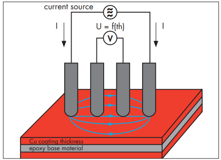 測量原理電氣4點電阻法。 使用兩個外部接觸針將直流電流引入銅涂層。 兩個內部接觸針用于挖掘電流產生的電位。 該電勢通過校準特性轉換為等效的銅厚度。 測量不受彼此相對的隔離銅涂層的影響。 |
