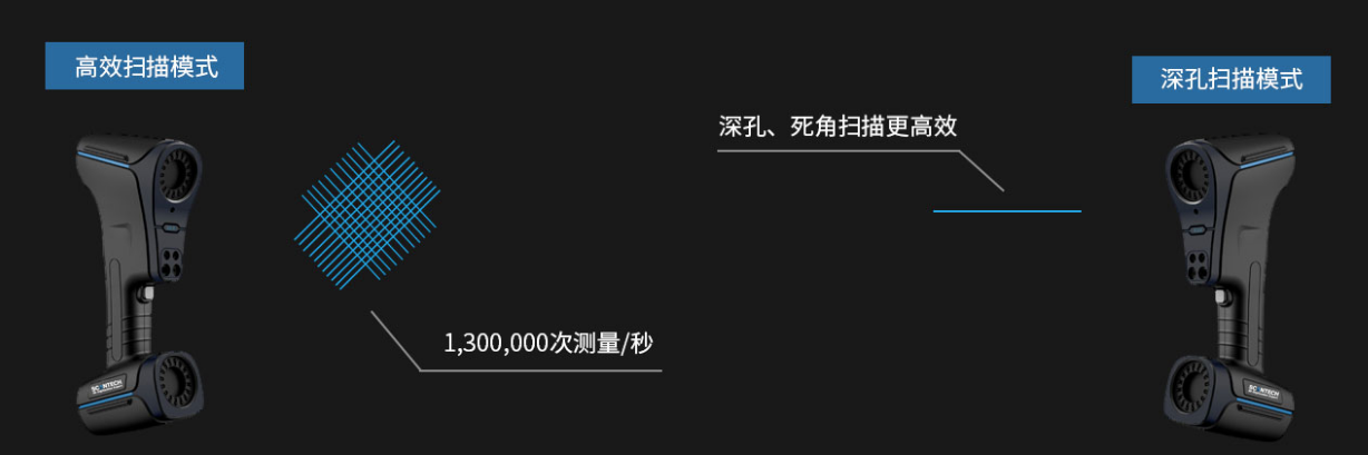 支持高效掃描和深孔掃描兩種模式,針對深孔和死角部位,可快速切換成1束藍色激光,實現三維測量