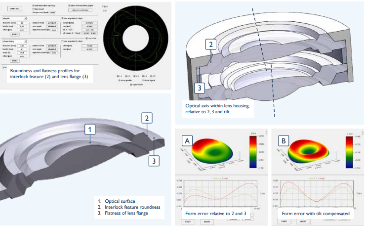 快速測量和分析光學表面和幾何特征。 測量光學表面和幾何特征,例如互鎖表面的圓度,平面透鏡表面的平坦度以及光學表面相對于這些特征的位置。 光學表面偏離中心并相對于互鎖特征位置和鏡頭法蘭傾斜。 分析結果(A)顯示了光學表面相對于聯鎖和透鏡法蘭的透鏡形狀誤差。 結果突出顯示了實際形狀誤差,如果將透鏡放入組件中并相對于這些特征對齊,則會看到該形狀誤差。 光學表面(B)顯示傾斜補償的形狀誤差 |