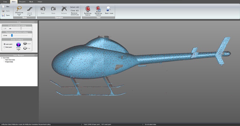 考慮到飛機的體積和精度需求,采用了掃描速率高達48萬次測量/秒的HSCAN三維掃描儀和MSCAN全局攝影測量相結合的測量方案,進行直升機的三維測量。MSCAN全局攝影測量可大幅提升三維掃描過程中的體積精度,精度高達0.02mm+0.025mm/m,使對整機和零部件的三維測量精度達到客戶預期的效果。