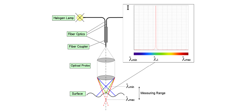 傳感器采用白光作為光源照射被測部件的表面。光源由CHRocodile控制單元生成,通過光纖傳送到探頭,然后探頭把白光色散聚焦成一排離散的焦距形成完整的光譜。不同波長對應(yīng)不同的焦距。只有焦點在工件表面的波長才能被識別系統(tǒng)識別,從而得到其所代表的精確距離。