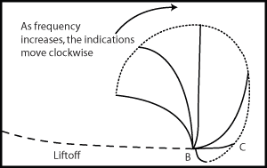 隨著頻率的增加,厚度指示會沿著順時針方向移動。圖5表明探頭從雙層蒙皮區域(B)移動到單層蒙皮區域時阻抗圖所出現的變化。后期,頻率會達到這種情況:缺陷指示變為水平方向,在兩點之間(B點和C點)不會有垂直波幅差。